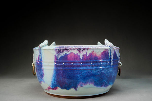 他擅長(zhǎng)拉大件鈞瓷,大畫缸是他的拿手好戲。這一點(diǎn),他說是在學(xué)習(xí)星航鈞窯藝術(shù)總監(jiān)劉紅生的基礎(chǔ)上,進(jìn)行了提升和轉(zhuǎn)化。劉宏舉這次獲得國(guó)家級(jí)大獎(jiǎng)的作品《金蟾鋪首大畫缸》就是多年功力的集中體現(xiàn)。