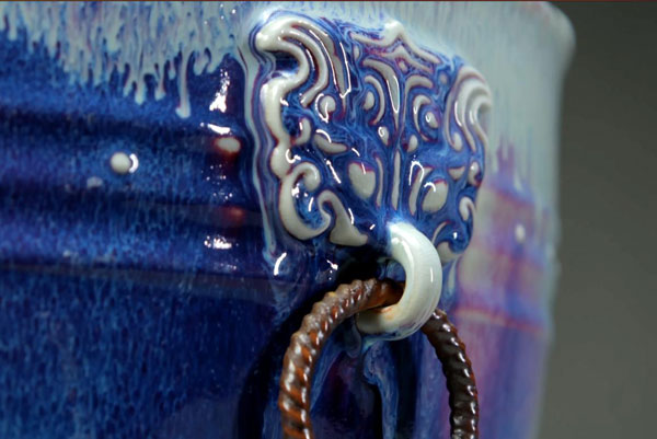 畫缸上部?jī)蓚€(gè)神獸鋪首,口銜活環(huán),莊重威嚴(yán),出神入化。圍繞腹部的一圈鼓釘和旋紋,為作品增添了古意之美。最值得稱道的是釉色,紅藍(lán)白相間,構(gòu)成了一幅山水國(guó)畫長(zhǎng)卷,山川河流盡現(xiàn)。