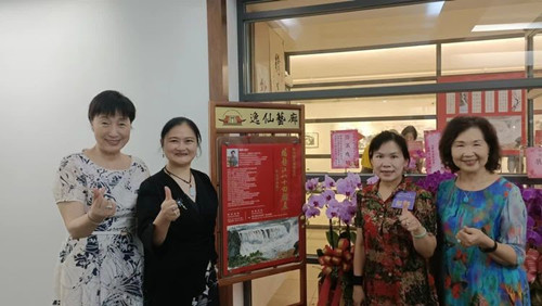 中國(guó)翰林書(shū)畫(huà)院秘書(shū)長(zhǎng)劉珺女士與何慶珍老師、邱秀莉老師、林清珠老師在展廳入口一同為楊靜江院長(zhǎng)80回顧書(shū)畫(huà)展點(diǎn)贊!