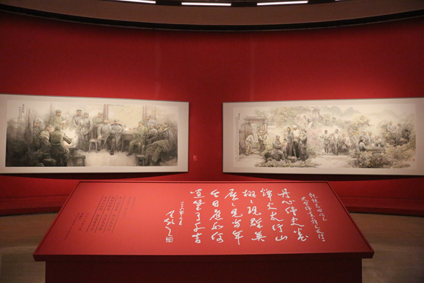 此次展覽著重展出了大型組畫《烽火太行》。2005年,趙志田先生為紀念抗戰(zhàn)60周年,創(chuàng)作此畫,2015年,他在原畫的基礎(chǔ)上重新構(gòu)圖增加內(nèi)容、篇幅,最終于2019年底完成?!斗榛鹛小肥蔷薹鶜v史組畫,由魚水情深、銅墻鐵壁、共謀抗戰(zhàn)、得道多助、正義之歌、普天同慶六個段落組成。為創(chuàng)作此畫,趙志田先生多次深入太行老區(qū)收集資料,反復(fù)思考構(gòu)圖,多次修改。全畫共刻畫了260多個人物,畫得形似而又傳神。整幅作品宛如一部交響樂。趙志田先生懷揣著揮之不去的“太行情懷”,熔鑄了抗日戰(zhàn)爭中犧牲的父輩給他留下的精神的影響,以及文革后多次深入太行引發(fā)的靈感的跡化,真實地表現(xiàn)了中華民族團結(jié)一致、不受屈辱、反抗侵略的民族精神,呼吁著現(xiàn)在社會更多的年輕人勿忘國恥、以史為鑒,要像先輩們學(xué)習(xí),學(xué)習(xí)民族精神,做國家的脊梁。