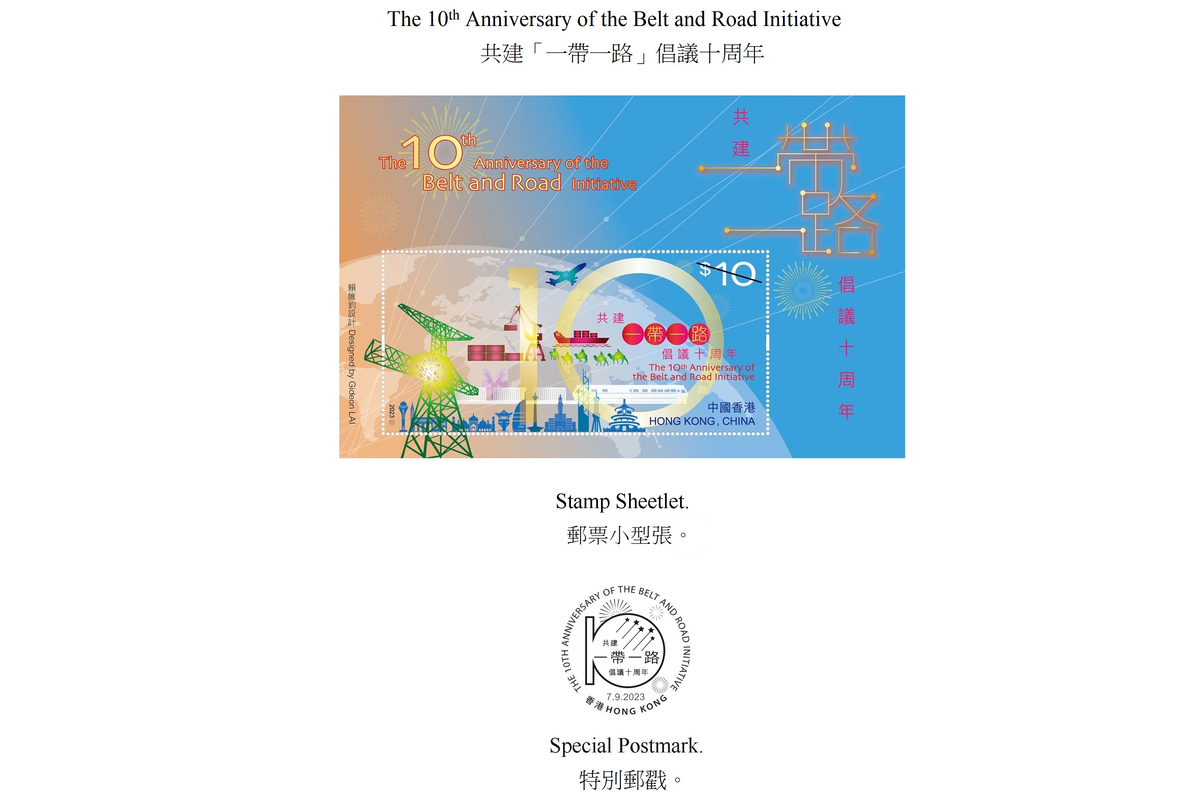共建“一帶一路”倡議十周年紀(jì)念郵票小型張9月7日發(fā)行。各郵政局同日為所有正式首日封、紀(jì)念封、注明首日字樣和本地地址的自制封提供實(shí)時(shí)人手蓋印服務(wù)。(圖片來源:香港特區(qū)政府新聞網(wǎng))