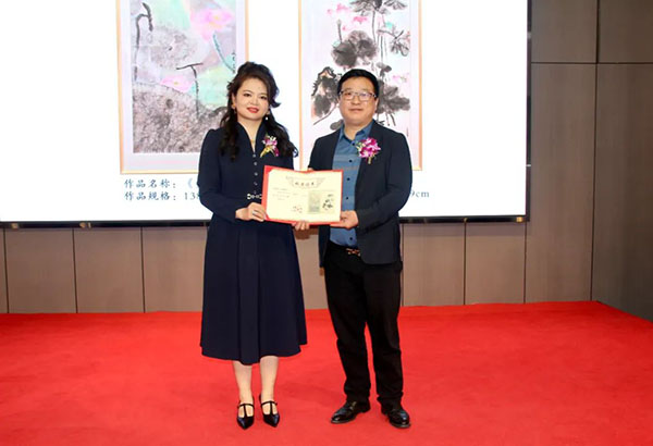 參展作者馬米娜向甘肅省藝術(shù)館捐贈(zèng)美術(shù)作品(右 甘肅省藝術(shù)館館長(zhǎng) 關(guān)成根)