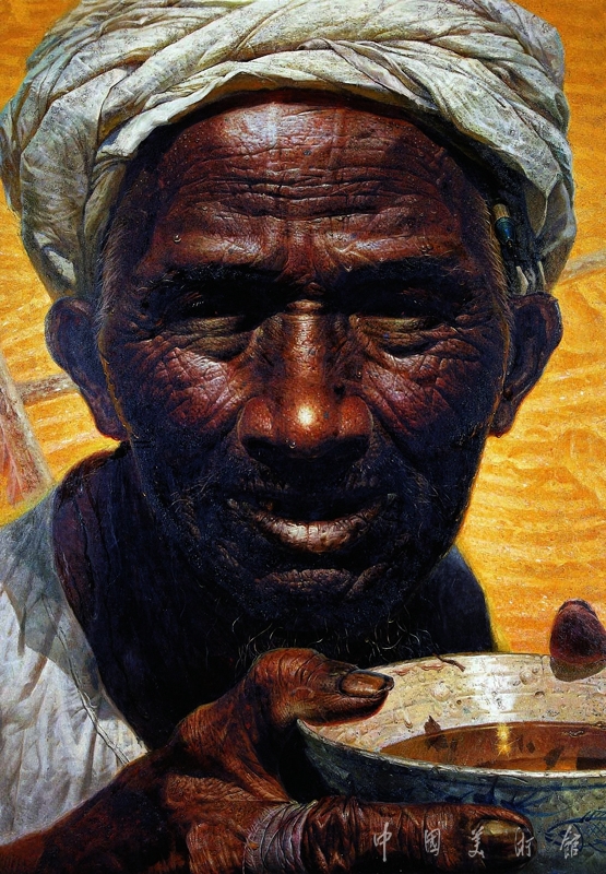 該畫用濃厚的油彩,精微而細膩的筆觸,塑造了一幅感情真摯、純樸憨厚的普通農(nóng)民形象。即使沒有斑斕奪目的華麗色彩,也沒有激越蕩漾的宏大場景,但作者依然刻畫得嚴謹樸實,細而不膩,豐滿潤澤。背景運用土地原色呈現(xiàn)出的金黃,來加強畫面的空間感,體現(xiàn)了人物形象外在質(zhì)樸美和內(nèi)在的高尚美。畫作獲第二屆全國青年美展一等獎。
