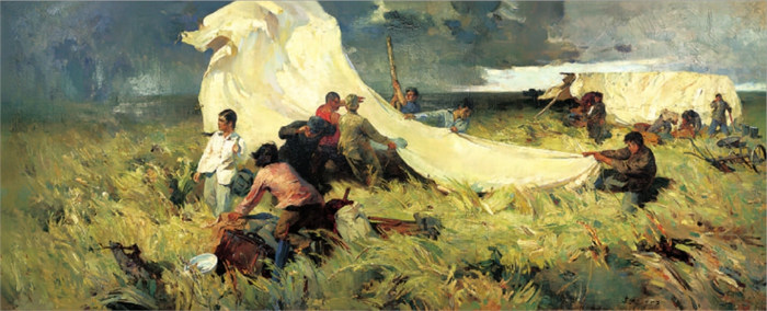 詹建俊 《起家》布面油畫 1957年 140厘米×348厘米 中央美術(shù)學(xué)院美術(shù)館