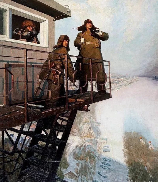 1973年12月,在北大荒當(dāng)農(nóng)工并參加兵團美術(shù)班業(yè)余創(chuàng)作的沈嘉蔚與李斌等人到烏蘇里江畔采風(fēng),其間登上了邊防站的瞭望塔,于是沈嘉蔚形成了《為我們偉大祖國站崗》(以下簡稱《站崗》)一畫的初步構(gòu)思,并產(chǎn)生了很強烈的創(chuàng)作沖動?!墩緧彙芬划嬜畲蟮奶攸c,也是其最為成功之處,就在于它的透視關(guān)系,即同時存在仰視視角和俯視視角。