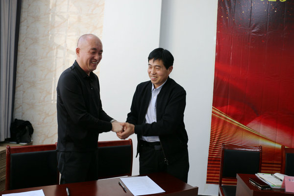 楊海卿(左)作發(fā)行動員講話并與各工作站簽定任務書。