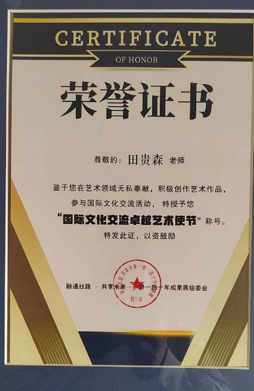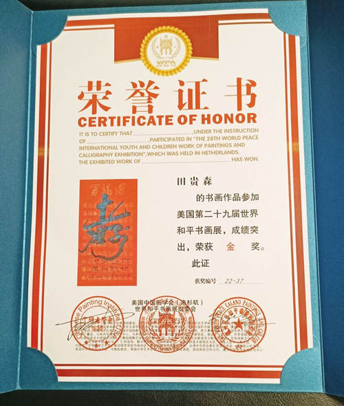 田貴森教授墨寶榮獲世界和平書畫展名家邀請(qǐng)賽金獎(jiǎng),這是他再次榮獲國(guó)際書畫大賽金獎(jiǎng),可喜可賀!