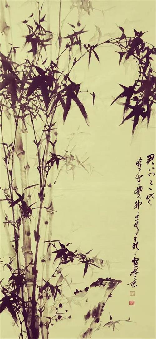 王新先生筆下的鷹、雄雞,紫藤、墨竹等系列作品各有千秋,他筆下的雄雞紅冠燦爛、羽毛色彩斑斕、形態(tài)各異、盡顯了藝術(shù)活力,或高昂頭顱遙望遠(yuǎn)方、或與母雞、雞仔成對成雙悠閑覓食、都在喻示藝術(shù)與生活的情趣,真的是超過物象之美。