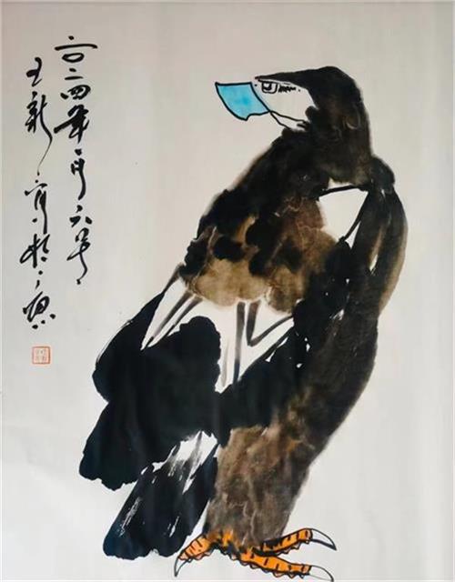 而他筆下的鷹則是栩栩如生,無論站立或飛翔都能體現(xiàn)天空霸主的雄風(fēng),讓人感受雄鷹雄壯的同時也體現(xiàn)了他創(chuàng)作的刻苦用功,一位藏家曾說過,王新先生筆下的鷹不僅形態(tài)逼真,在神韻上也達到了極高的境界,在對他畫功敬佩的同時也讓人對鷹的精神滋生敬畏之意。