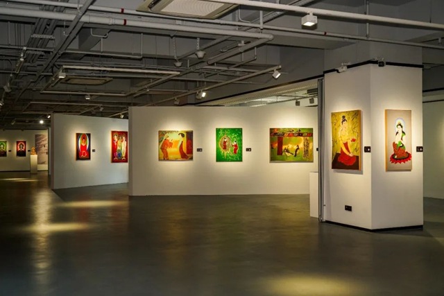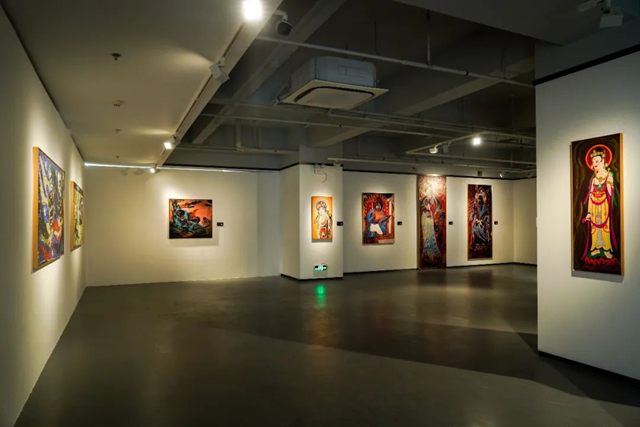 本次展覽展出北京外國語大學(xué)藝術(shù)研究院院長,碩士、博士研究生導(dǎo)師;教育部長江學(xué)者;北京靳尚誼藝術(shù)基金會學(xué)術(shù)顧問寧強(qiáng)教授近期創(chuàng)作53幅大尺幅布面油畫以及丙烯絹本作品。作為敦煌學(xué)新禪畫派的創(chuàng)立人,寧強(qiáng)教授以獨(dú)特的色彩組合、新穎的用筆形式打破了中西方藝術(shù)的邊界線。其作品既展現(xiàn)了早期石窟壁畫和雕塑的輪廓分明、線條簡練之特點(diǎn),又巧妙處理了人物、動物比例,創(chuàng)造出卡通般的面孔。