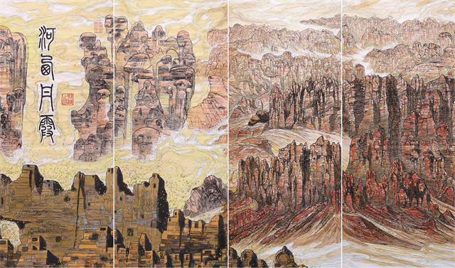 我們順著絲綢之路走到黃土高原面前,我們看到的是世界上最大的黃土塬景觀,塬的四周是神雕鬼塑的溝壑、梁岇和崾峴,巨大的塬猶如起伏的黃河波濤拱托著。數(shù)以千萬(wàn)計(jì)的支溝在頻繁的洪水沖刷下不斷地蠶蝕黃土塬,各溝頭像無(wú)數(shù)魔爪伸向黃土塬。黃土塬卻像母親那樣敞開(kāi)胸懷把自己身上最豐腴的肉一塊一塊地割下來(lái),順著洪水流送到中原大地,輸送進(jìn)大海,建造起一片又一片孕育中華文化的沃土,自己則留下了溝壑縱橫、千瘡百孔的軀體。我們?cè)诋?huà)前深深感悟到,這,就是母親的大地胸懷,是萬(wàn)古傳唱的中華精神。