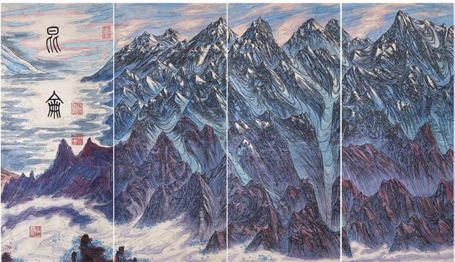 我們的視線越過(guò)世界屋脊,看到的是波瀾壯闊、五彩斑斕、氣勢(shì)磅礴的絲綢之路那震撼人心的景觀。我們首先看到的是古絲綢之路上最為艱險(xiǎn)和神秘的帕米爾高原,接著是最偉大的山脈昆侖山。古往今來(lái)的人們稱(chēng)為“萬(wàn)山之祖”、“中華龍脈”、“萬(wàn)神之鄉(xiāng)”的昆侖確實(shí)成為“亞洲脊柱”。“赫赫我祖”來(lái)自昆侖,中華民族的文化史上昆侖具有顯赫地位,正因如此作者用長(zhǎng)達(dá)四十多米篇幅創(chuàng)作出地動(dòng)山搖的昆侖山的氣勢(shì),讓我們無(wú)法克制從內(nèi)心發(fā)出驚嘆!敬畏!