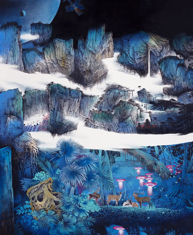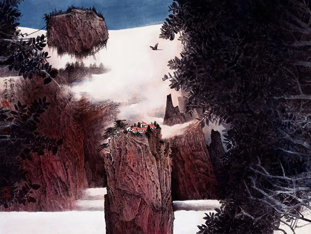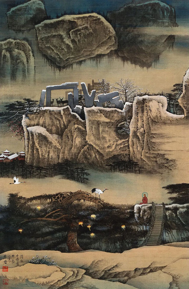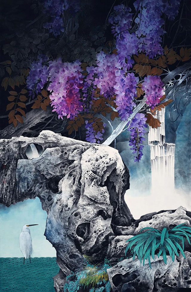 近幾年來,未君又轉(zhuǎn)向山水畫的研究與創(chuàng)作,花鳥退居其次。他像一個隱者,神游古今,沉浸在他充滿浪漫主義夢想的世界中,保持他獨立思考的空間和創(chuàng)作自由,另辟蹊徑,不趨主流,追尋他超現(xiàn)實主義的精神圣境。