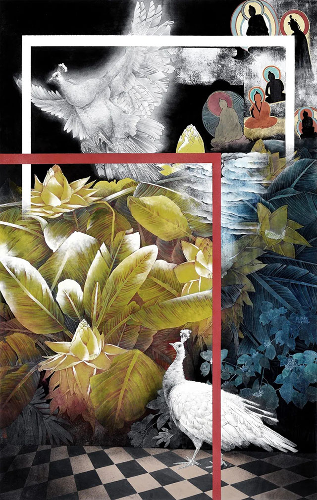 畫中描繪了兩只孔雀一前一后屹立在幾支橫斜過來的桃花樹下,孔雀后面是茂盛的棕櫚和綠植;桃樹上方,一只紅耳鵯鳥緩緩飛向遠(yuǎn)方。詩中敘述的是作者的狀態(tài)與心境,而這恰巧顯示出學(xué)者型藝術(shù)家未君別樣的心態(tài)與定位。事實上,他也算是我認(rèn)識的畫家中極獨特的一位。他不只是作畫、也讀史、讀哲學(xué)、文學(xué)及宗教,還博覽西方史學(xué)及藝術(shù),撰寫了大量充滿哲思的藝術(shù)隨筆。