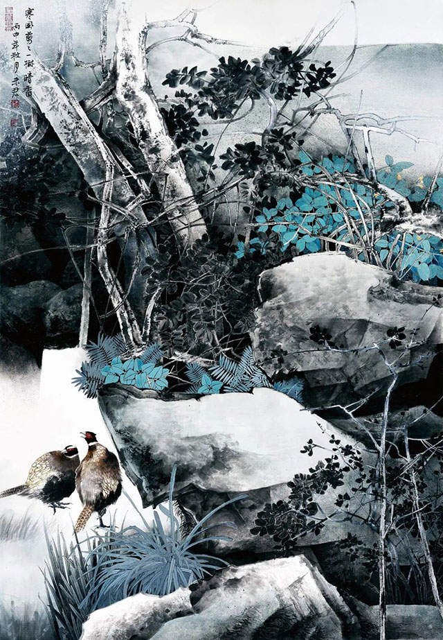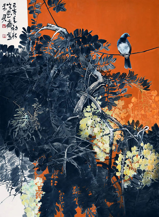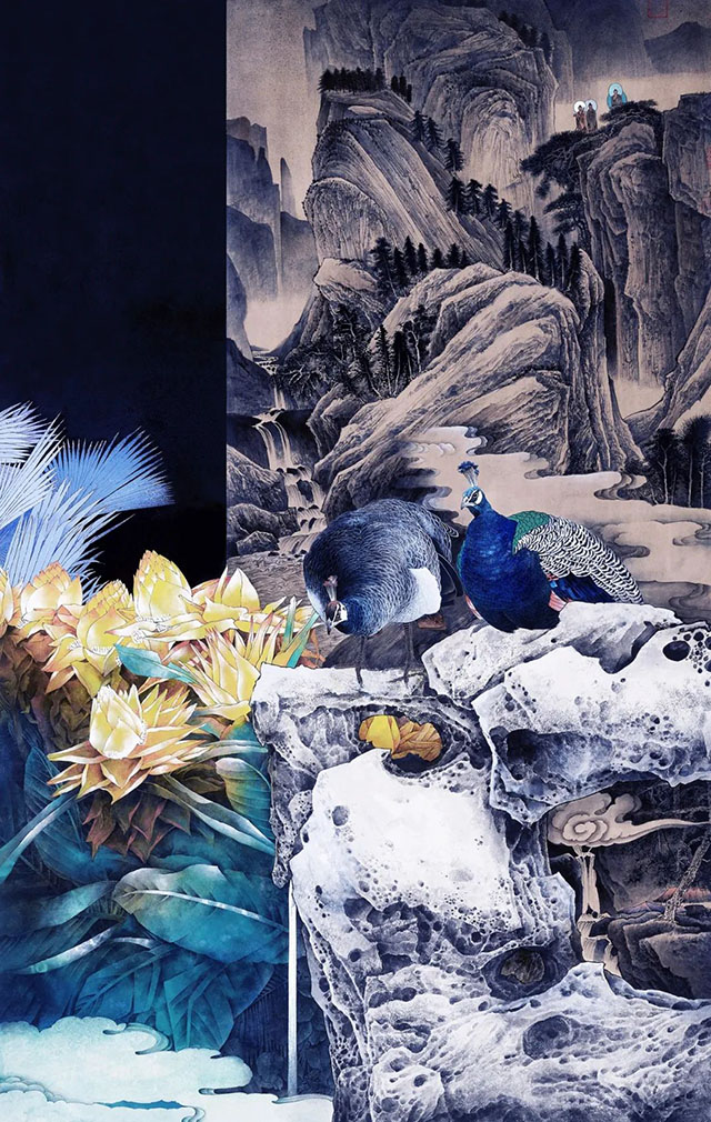 書畫界時下流行一種觀點,強調(diào)書畫藝術(shù)的“純粹性”,剝離文化屬性,這實際是降低書畫藝術(shù)品評的標(biāo)準(zhǔn),在這樣的背景下,詩、書、畫兼擅的未君就格外令人關(guān)注。在美術(shù)界,能打通工筆和寫意,且著述豐厚,有較大成就者的藝術(shù)家并不多見。數(shù)十年來,未君不斷在繪畫實踐與藝術(shù)美學(xué)間游走,沉浸在屬于他的大自然中,所有的一草一木、一花一鳥,都能使未君獲得無限的激情與可能性。為此,他創(chuàng)造了大量筆墨與色彩相結(jié)合、兼具艷麗與古雅之美的重彩花鳥作品。其作品工寫結(jié)合,色彩斑斕又重點突出、奪人眼球。他還擅于造境,常將花鳥、孔雀、梅花鹿置于大塊的山石之間,這種組合使他的作品蘊含著一種獨特而深峻的“骨力”,既遠(yuǎn)離靡弱之風(fēng),又超越于傳統(tǒng)花鳥的清新秀麗。從寫意花鳥到工筆重彩,未君孜孜以求不斷進(jìn)取,他畫面中那些絢爛的色彩張力,也得益于他對于音樂的節(jié)奏感、神秘性與詩情發(fā)揮到了極高的境界,使人著迷和贊嘆。