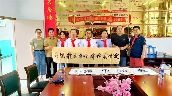 活動期間,老兵潘磊與諸位藝術(shù)家一行與校方進(jìn)行了友好溝通,并與學(xué)生進(jìn)行了互動,互動期間學(xué)生為到場所有人員佩戴了紅領(lǐng)巾,藝術(shù)家們?yōu)樾7劫浰土斯膭顚W(xué)好文化課等內(nèi)容的書法作品。