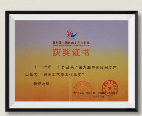 之所以結(jié)緣蘭亭,緣于2009年10月,趙秀林老師歷時8個月創(chuàng)作的大型手工鑿刻銅雕《蘭亭序》榮獲“第九屆中國民間文藝山花獎”,該獎項由中宣部指導(dǎo),中國民間文藝家協(xié)會主辦評選,是中國民間文藝的最高獎。此外多款尺寸、多種銅質(zhì)(黃銅、白銅、紫銅)的“書法蘭亭序”主題作品,榮獲多項國家級、省級金銀獎,數(shù)件銅雕《蘭亭序》被國內(nèi)外藝術(shù)館收藏。