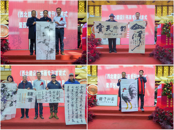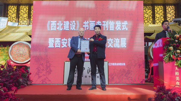 在首發(fā)式揭幕儀式上,周劍鋒、丁風(fēng)雷、馬天罡、許衙評、周養(yǎng)輝、亓宏濤等嘉賓共同為《西北建設(shè)-墨潤中國》書畫??夷?,標志著該刊物正式與讀者見面。隨后,西北建設(shè)雜志社運營中心主任、本次活動總策劃焦點主任為刊物題詞者王康將軍頒發(fā)證書,并接收牌匾。