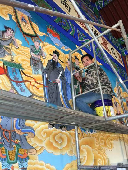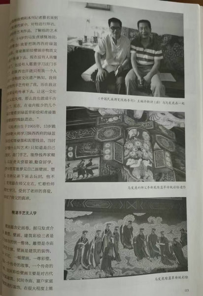 青浸墨彩繪壁畫傳承人馬發(fā)虎,自幼喜歡繪畫,十四歲便拜扶風(fēng)民間傳統(tǒng)彩繪壁畫大師李新乾學(xué)藝,他悉心鉆研、不斷精進(jìn),勤勞刻苦、以藝養(yǎng)家,手法嫻熟、脈絡(luò)清晰,足跡遍布大江南北的寺廟景區(qū)和文保單位。他不僅深刻領(lǐng)悟到了青浸墨彩繪壁畫技藝的精髓,而且還撰寫了綠藍(lán)草彩繪技法、青浸墨傳統(tǒng)壁畫技法等多篇理論文章,發(fā)表在《陜西市政》《西北建設(shè)》等刊物雜志和網(wǎng)絡(luò)媒體,為傳承和弘揚中華優(yōu)秀傳統(tǒng)文化做著自己努力與貢獻(xiàn)。