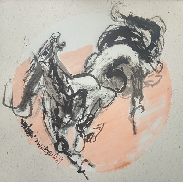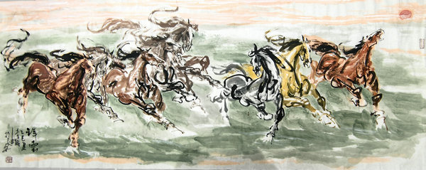 2. 造型表現(xiàn):對(duì)馬的造型進(jìn)行了藝術(shù)化處理,并非追求寫實(shí)的精準(zhǔn),而是注重抓住馬奔跑時(shí)的動(dòng)態(tài)神韻。以簡(jiǎn)潔而夸張的線條,表現(xiàn)出馬的肌肉、骨骼和動(dòng)態(tài),雖不似西方寫實(shí)繪畫那般細(xì)膩入微,但卻能生動(dòng)傳達(dá)出馬的活力與精神氣質(zhì)。比如雙馬或多馬同框的畫作,通過不同姿態(tài)展現(xiàn)馬群奔騰的氣勢(shì)。