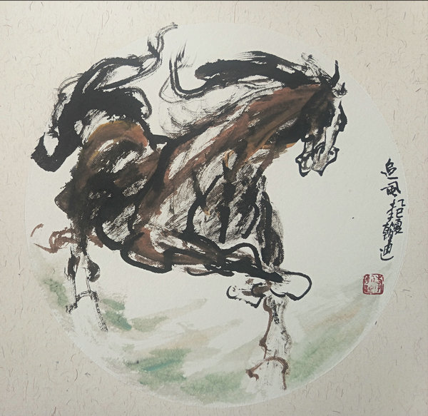5.創(chuàng)作背景:作者李翰迪農(nóng)民出身且自學(xué)成才,西北邊陲服役經(jīng)歷可能賦予他對(duì)自然、生命力量更深刻的理解,這種經(jīng)歷或許是他畫作中展現(xiàn)出馬的雄渾氣魄與自由精神的靈感來源。他將自身經(jīng)歷與感悟融入創(chuàng)作,在傳統(tǒng)水墨畫基礎(chǔ)上,融入個(gè)人對(duì)馬的獨(dú)特情感與理解,形成別具一格的藝術(shù)風(fēng)貌。姓名學(xué)家、能量大師霍藝元曾贊其畫作是:“悲鴻現(xiàn)靈,騰空出世”,徐悲鴻先生的長(zhǎng)孫徐曉陽寄語李翰迪:“發(fā)揚(yáng)悲鴻精神”。從李翰迪畫風(fēng)看有傳統(tǒng)水墨神韻,但并非簡(jiǎn)單模仿徐悲鴻,而是有自身探索與表達(dá)。