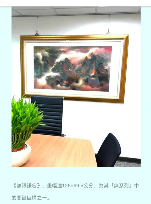 《無(wú)限謙宏》畫(huà)幅達(dá)126×69.5公分,為其“無(wú)系列”中的關(guān)鍵巨構(gòu)之一。根據(jù)藝術(shù)市場(chǎng)行情,該幅作品以“每才六萬(wàn)元”之估價(jià)起跳,全幅價(jià)值上看60萬(wàn)以上。畫(huà)作除藝術(shù)價(jià)值外,亦因具備五行藏氣、聚財(cái)風(fēng)水的構(gòu)圖理念,受到不少企業(yè)主與收藏家的青睞與追捧。
