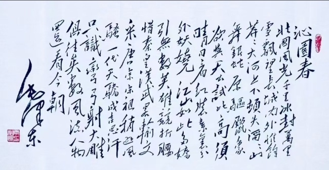 - 創(chuàng)作實踐成果豐碩:他的書畫作品多次在全國政協(xié)、全國新聞出版界、中直機關(guān)及中央電視書畫頻道等舉辦的高規(guī)格活動中展出并獲獎,具有廣泛的影響力。其仿毛澤東書法作品尤為出彩,《長征》《滿江紅》《沁園春》等經(jīng)典詩詞的書法創(chuàng)作,不僅精準(zhǔn)還原了毛體書法的雄健氣勢與獨特韻味,更融入了個人對詩詞內(nèi)涵的深刻理解,其中《沁園春·雪》還在2013年中央電視臺書畫頻道迎春活動中展播,讓更多人領(lǐng)略到毛體書法的魅力。