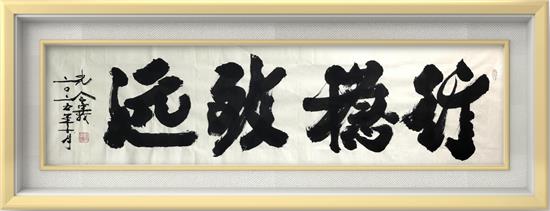 這種對(duì)漢字本真的守護(hù),源于他對(duì)書法與傳統(tǒng)文化的深刻認(rèn)知,深信只有書法才是文化的忠實(shí)記錄者,而新行楷體正是以筆墨續(xù)寫了中華文明的新篇章。其作品中諸如《踔厲奮發(fā) 勇毅前行 守正創(chuàng)新 行穩(wěn)致遠(yuǎn)》、《上善若水 厚德載物 清廉守正 行穩(wěn)致遠(yuǎn)》、《勇毅前行》、《勇往直前》、《行穩(wěn)致遠(yuǎn)》《篤行致遠(yuǎn)》、《福蘊(yùn)華堂》、《百福具臻》等作品既延續(xù)了傳統(tǒng)書法的筋骨神韻,通過墨色濃淡與線條剛?cè)岬膶?duì)比,傳遞出新時(shí)代的強(qiáng)大力量和文化自信,履行著新時(shí)代書法家應(yīng)為時(shí)代而作為時(shí)代而歌的藝術(shù)擔(dān)當(dāng)。